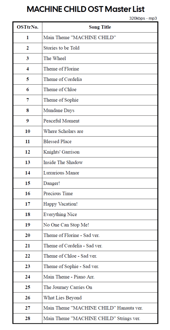 マシンチャイルドのBGM、全28曲を収録したサウンドトラックを9月5日、ゲームと同時発売します。ゲームの音楽を気に入ってくれた方は是非、高音質320kbps mp3で「マシンチャイルド」の為に書き下ろされた帆足圭吾の楽曲の数々をお楽しみください。